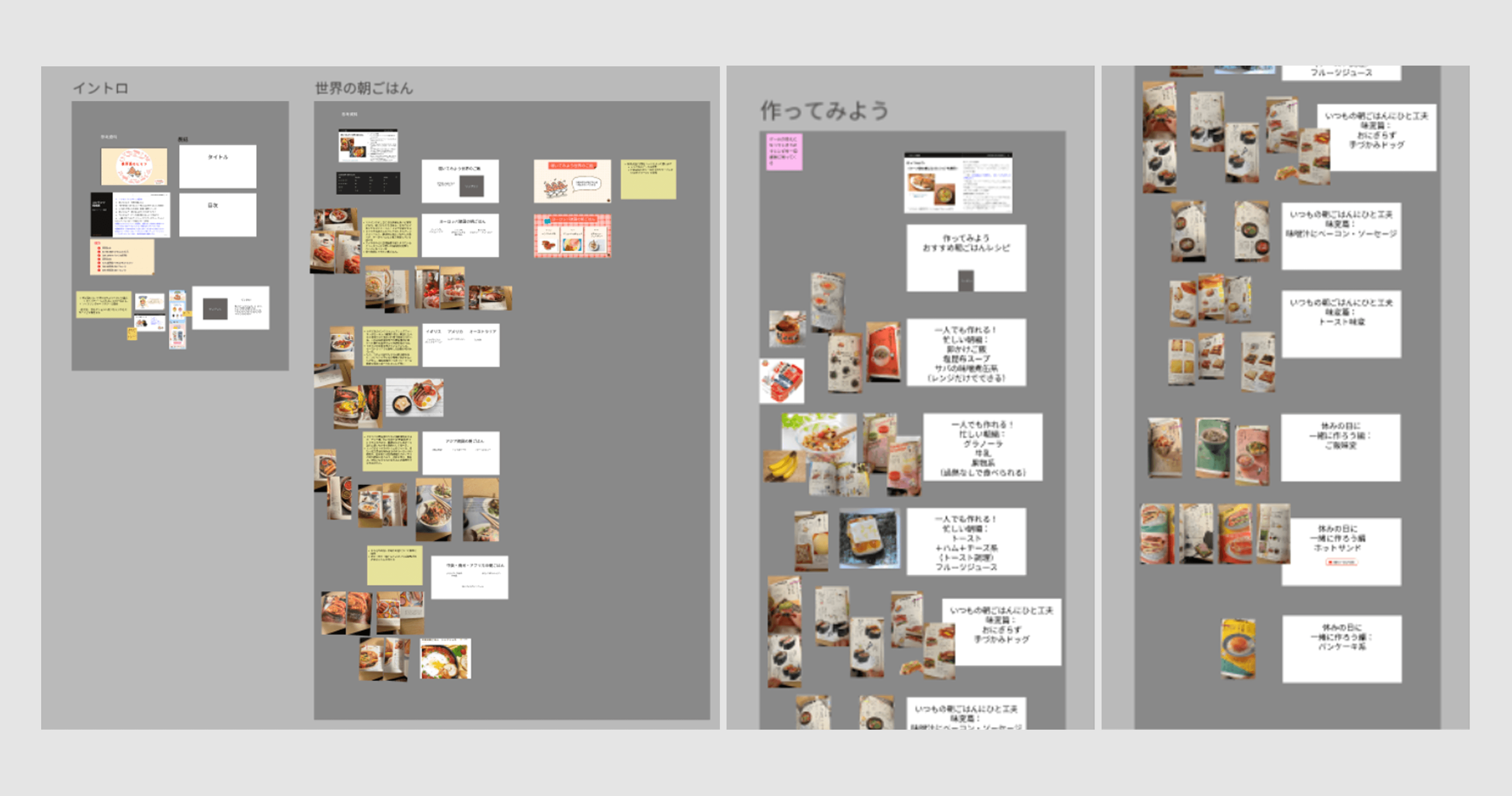 ブレインストーミングで出てきたアイディアをもとに、全体としてストーリーに仕立てるため、章やスライドの構成を定義。ストーリーボードを作り、ビジュアルの方向性やテキストコンテンツの概要を埋めていきました。