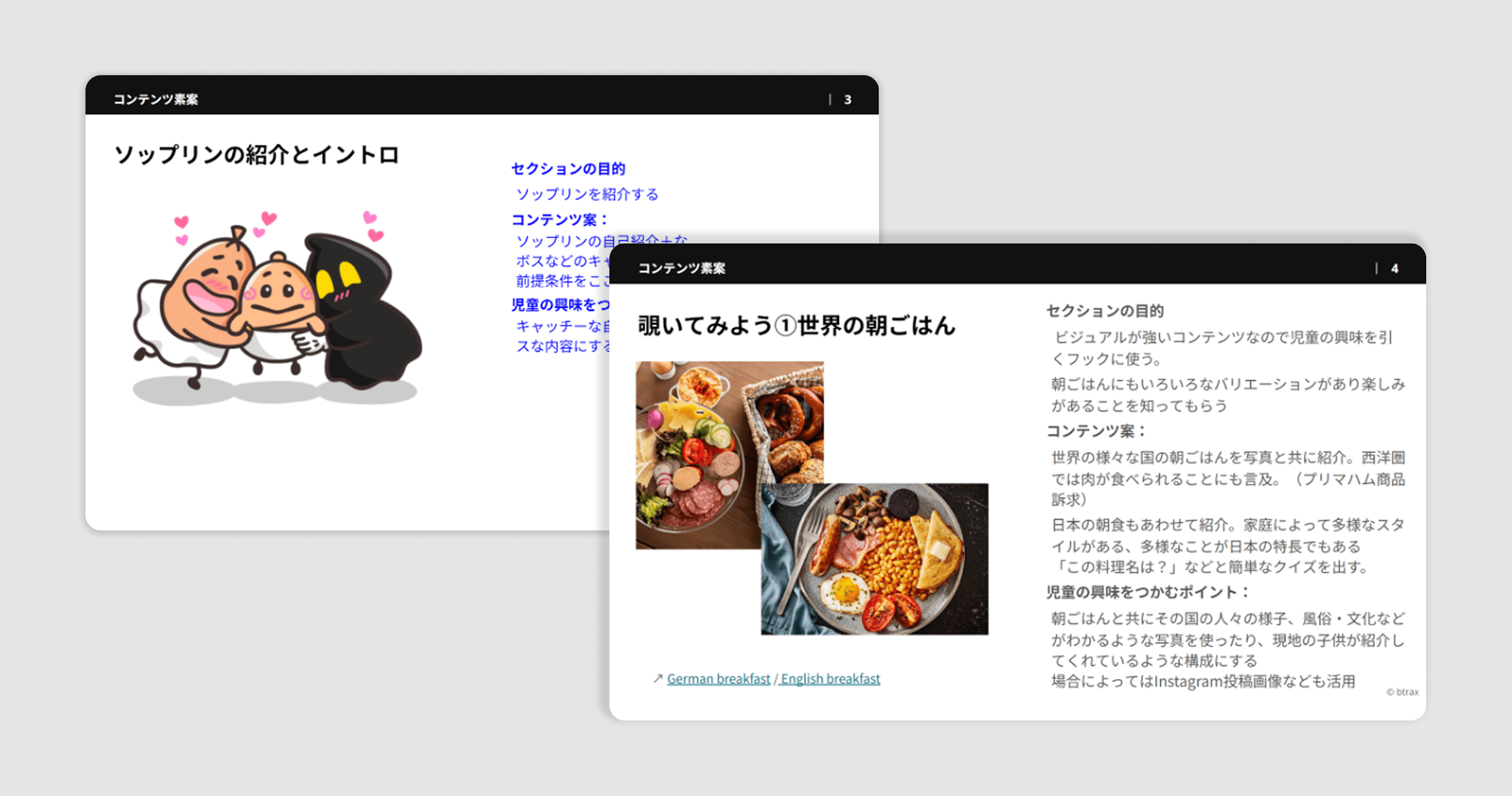 「朝ごはんを食べよう」というテーマのもと、どのようなコンテンツであれば子どもたちの興味をひくことができるか、ビートラック社内でブレインストーミングを実施。小学生の視点や、共働き家庭の朝ごはん事情、アイドルや有名運動選手への憧れ、ダイエット、子どもが自分で用意できる朝ごはん、など多様な観点でアイディアを抽出。